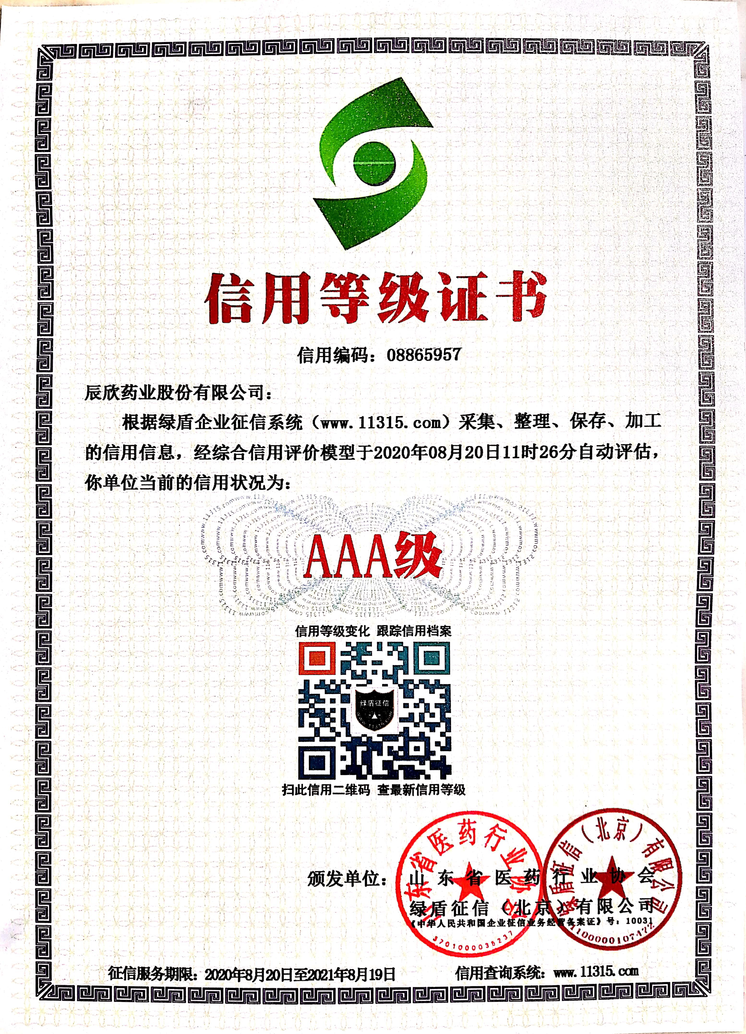 辰欣藥業立足于醫藥行業,秉承“推陳出新、誠實守信”的經營理念,將誠信作為企業經營發展的軟實力,不斷完善經營活動中的信用制度,先后獲得“守合同重信用”企業、“全國產品和服務質量誠信示范企業”、“全國百佳質量誠信標桿示范企業”、“企業信用評價AAA級信用企業”等多項誠信榮譽。