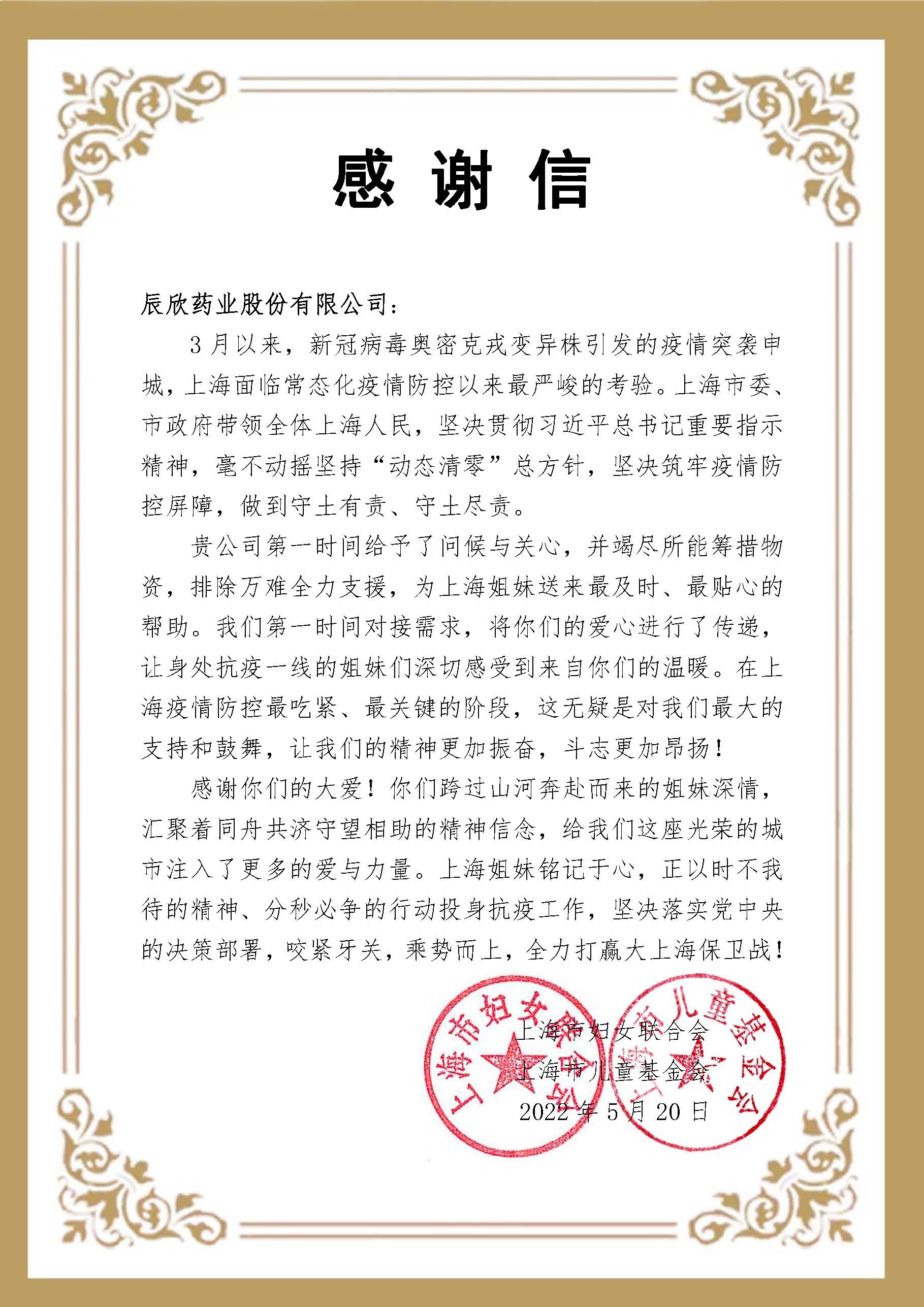 近日,辰欣藥業收到一封來自上海抗疫前線發來的感謝信,感謝公司在上海面臨最嚴峻的疫情考驗時,第一時間給予問候與關心,并竭盡所能籌措物資,排除萬難全力支援,為上海送去最及時、最貼心的幫助。
